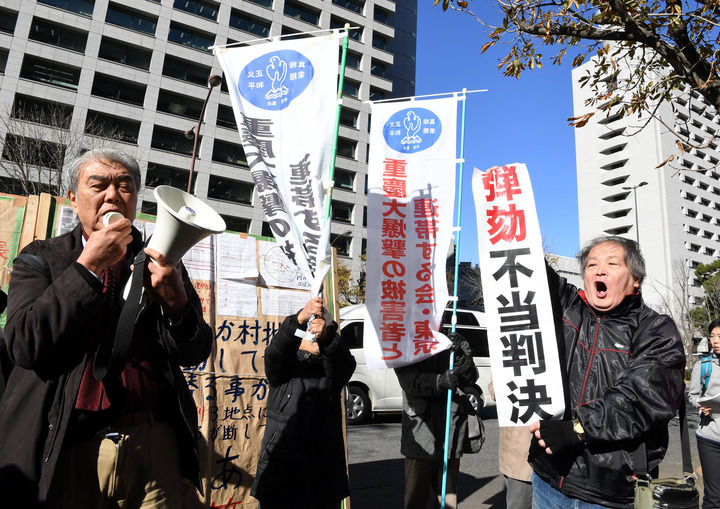 2017年12月14日,在日本东京高等法院外,日本友人手举标语抗议二审判决结果。新华社记者 马平 摄