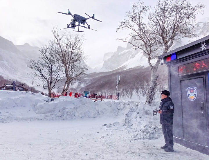 1月21日,在长白山北景区,长白山公安局池北区分局光明森林派出所民警正在使用无人机巡航。本组图片均为新华每日电讯记者 王帆 摄