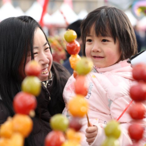 家长和孩子在年货大集上挑选糖葫芦。新华社记者 陈斌 摄