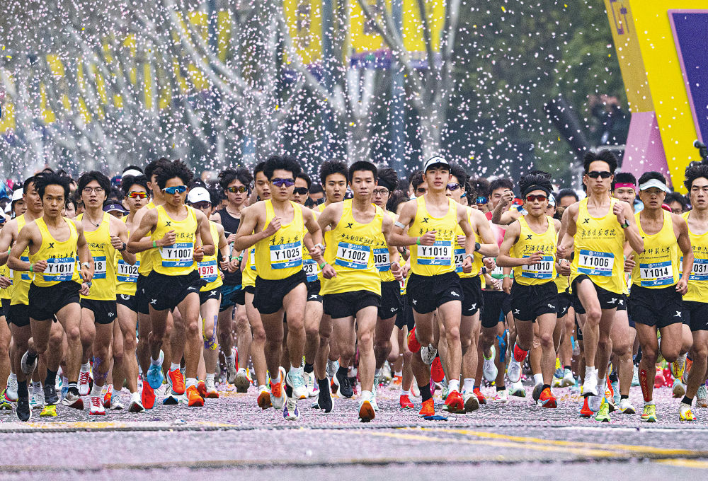 3月22日,2026武汉马拉松比赛选手在“花雨”中奔跑。新华社记者肖艺九摄