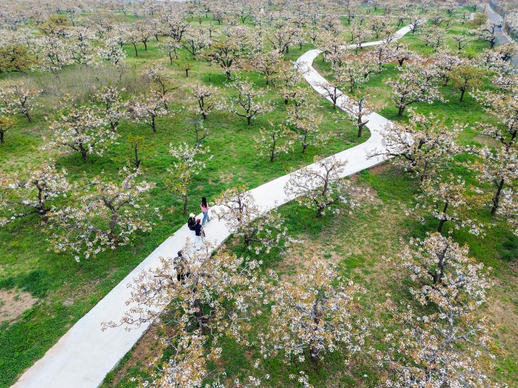 4月3日,游客在梨园内赏花(无人机照片)。时下,山东省滕州市柴胡店镇近万亩梨园进入盛花期,梨花竞相绽放。新华社记者 朱峥 摄
