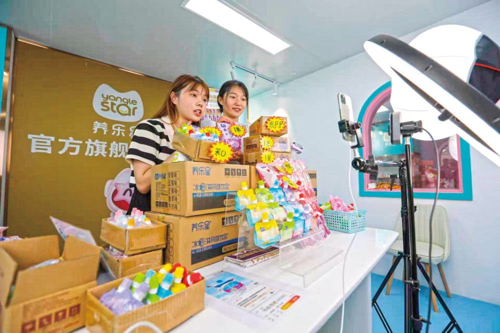 在江西养乐星生物科技有限公司直播间里,东乡区电商服务中心的主播正在帮忙销售企业生产的产品。(饶方其摄)