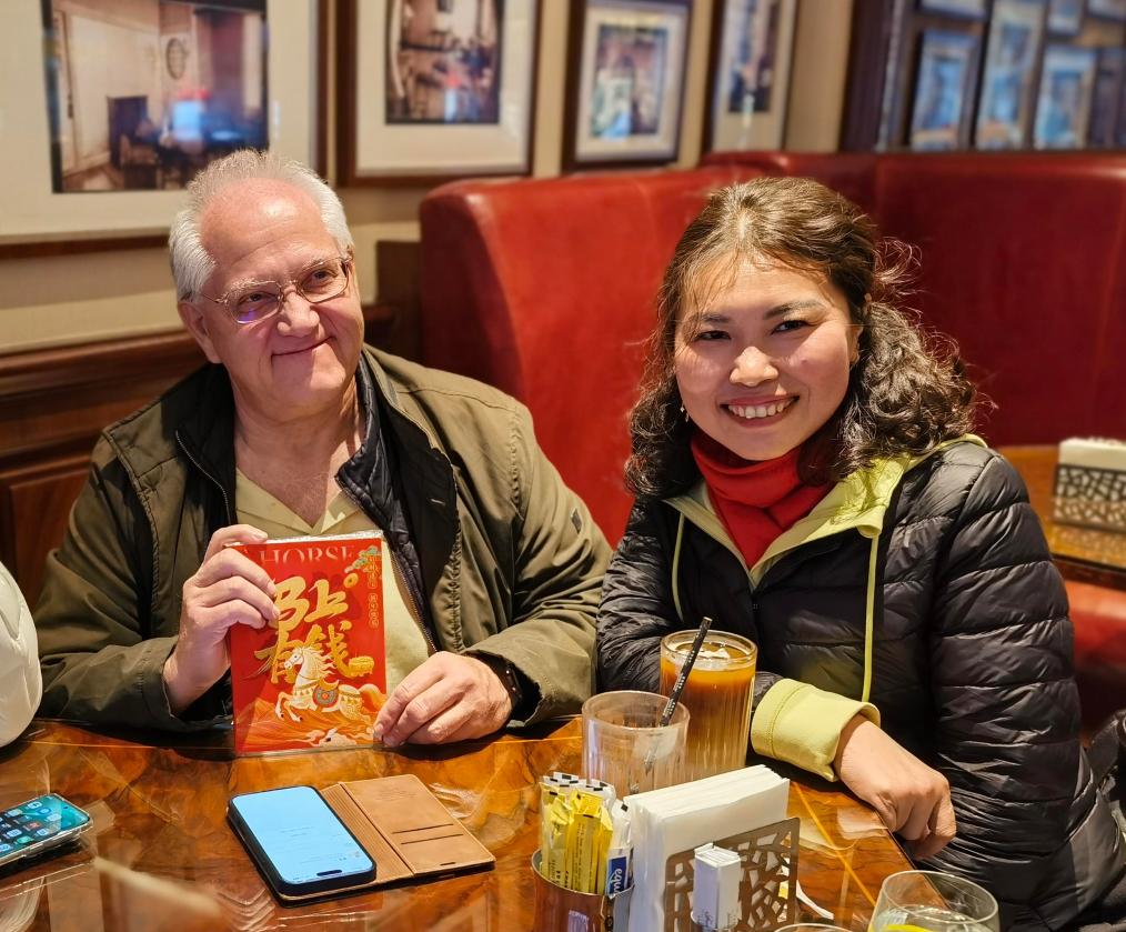 2月16日,希腊游客(左)与导游(右)在上海一家咖啡厅合影。新华社记者 陈爱平 摄
